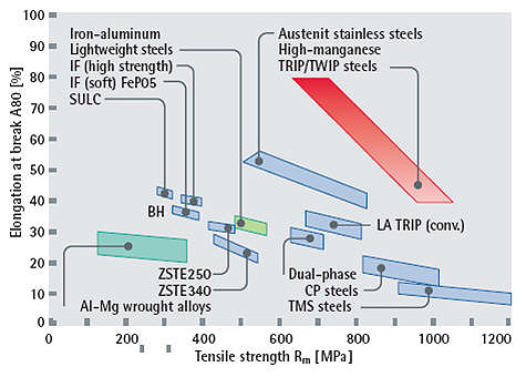 Figure 3: The diagram shows the very high stresses that TRIP/TWIP steels (red) can resist, compared to conventional deep drawing steels (blue).